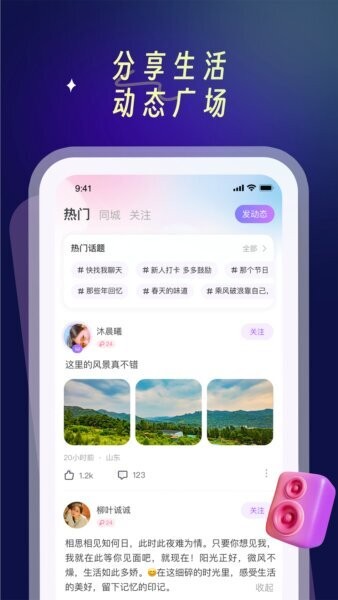 动态广场分享:用户可以在动态广场发布文字、图片或生活感悟,与社区成员分享生活中的美好瞬间。通过互动评论和点赞,可以结识更多兴趣相投的朋友。