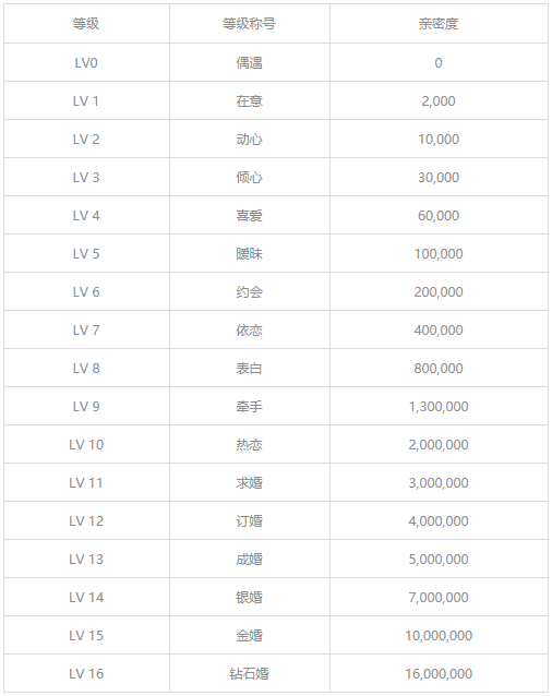 亲密等级:等级从低到高依次为