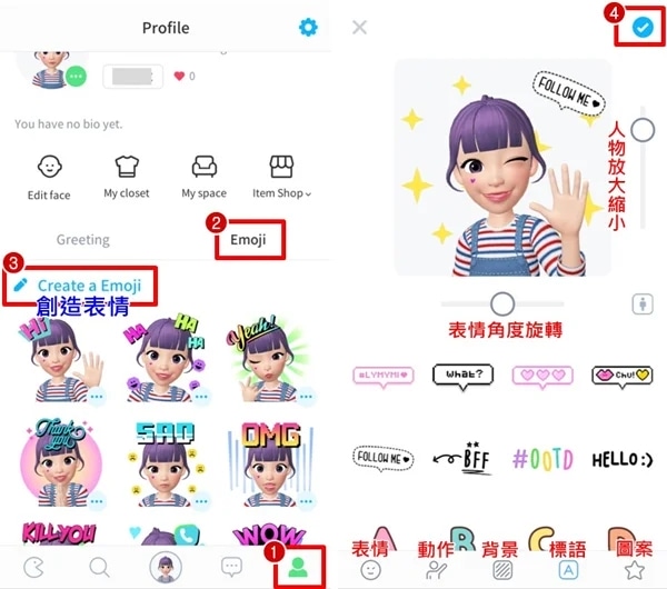 1、【个人资料】→【表情】→【创造表情】→【确认】;