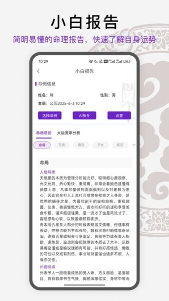 新手用户可选择小白报告模块,快速获得包含人格特质、运势走向、健康婚姻等简明报告,方便快速掌握整体状况。