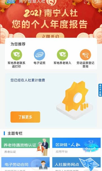 为南宁市人力资源和社会保障局官方APP,目前提供查社保、找工作、领补贴、维权举报、申领电子社保卡、业务跟踪、区块链+人社、电子劳动合同等180多项线上办事、查询服务。