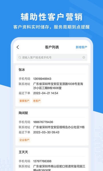 客户档案管理,联系人管理、设备档案管理,客户合同管理,服务计划管理,服务提醒管理。