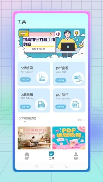 2. 工具 ・ PDF专业工具区:工具页聚合“PDF检索、PDF查看、PDF编辑、PDF制作”四大能力,支持对本地PDF进行搜索定位、分页阅读、文字修改与重新导出,也可根据图片或文稿快速生成新的PDF文档,让手机立刻拥有接近桌面办公软件的处理能力。