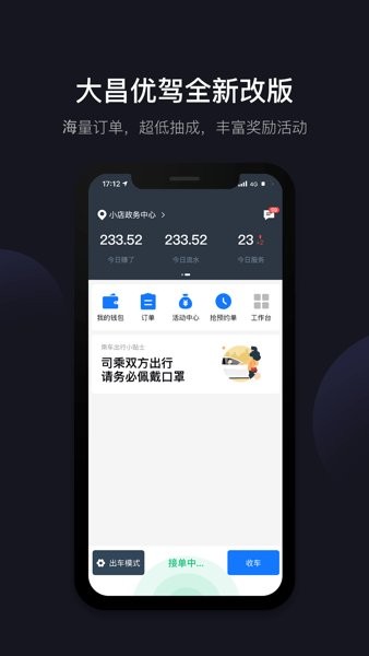 “大昌优驾”是大昌出行司机版,通过它司机师傅们可以接到来自“大昌出行”乘客端乘客的用车呼叫,接到乘客用车订单后,联系乘客―接乘客―送乘客到目的地―订单完成。全新的移动出行新形态。