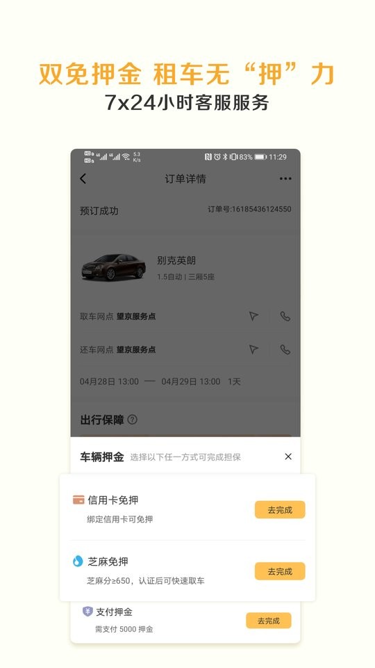 绑卡或芝麻分600分及以上,享受租车预授权+违章押金双重免押服务