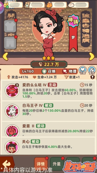 梦每隔一段时间会召唤2个白马王子,梦的被动技能可以给白马王子进行减伤和每秒回复一定的血量;梦开启主动技能,会增加白马王子自身的攻击力和防御力,并击晕白马王子周围的敌人;和电筒西一样,梦的召唤物可以吸收敌人的攻击,而且由于梦的主动技能是可以增加自身和召唤物的攻击力,这样梦和白马王子也有一定的输出能力,大侠可以根据实际需要进行选择~