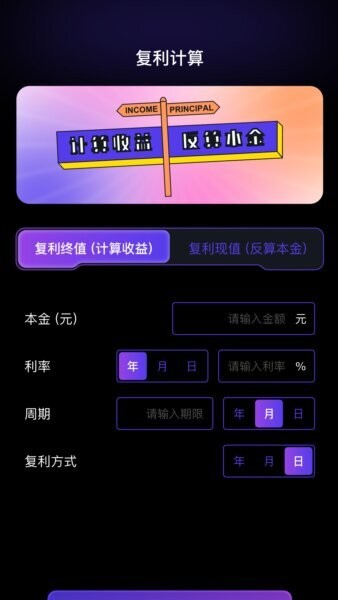支持本金和收益的复利计算,帮助用户合理评估投资回报率,辅助理财规划。