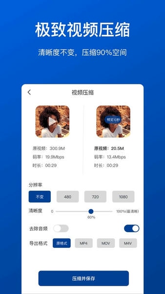 【视频压缩】多种压缩级别,支持主流格式视频压缩,缩小视频体积,尽量保存画质,优化内存空间。