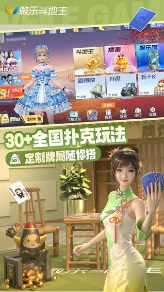微乐斗地主游戏画面高端大气上档次,风格简洁明了,动画效果绚丽,三人斗地主,二人斗地主,跑得快,刨幺,填大坑,三打一,升级,保皇,锄大地,够级,双扣,四团等。