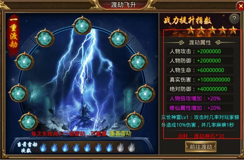 游戏内玩家可以通过渡劫飞升来提升人物属性,游戏共设置十重渡劫,每重渡劫需要经历九道雷劫,每渡劫失败一次,下次渡劫将减少一道雷劫。雷劫有十种不同类型,造成的伤害也不一样,每次玩家渡劫遭受的雷劫是随机的。