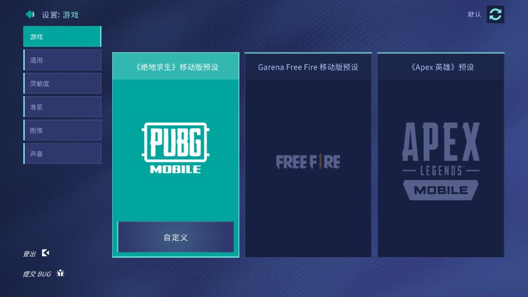 2、为热门射击游戏定制预设 提供多款热门手游预设配置,例如 Call of Duty、PUBG Mobile 等,你只需选择对应游戏,即可快速加载官方推荐的视野、灵敏度和按键布局,省去长时间调参试错。