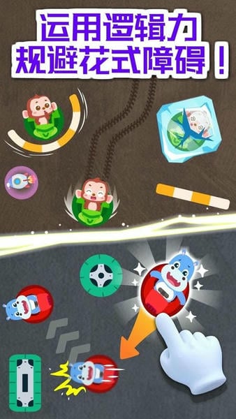 冰块把小伙伴困住了,宝宝快开动碰碰车,撞碎冰块,营救伙伴;赛场上的轮胎和风扇,会阻碍碰碰车的行驶,宝宝要规划好路线,巧妙躲避障碍;
